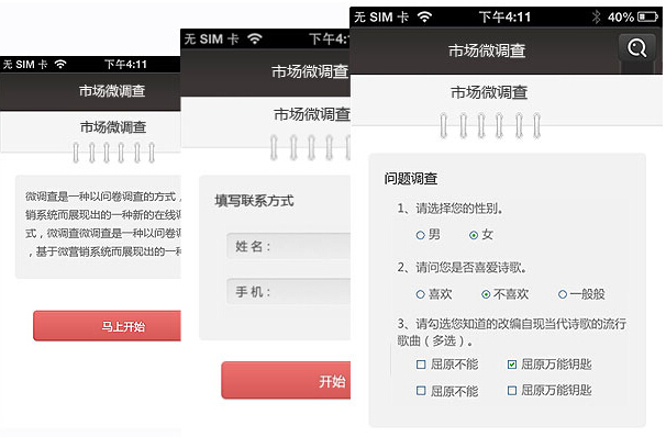 微調查是一種以問卷調查的方式,基于微營銷系統而展現出的一種新的在線調查應用方式,微調查已經完成調查項目數十個,涉及游戲、快速消費品、汽車、房產、美食、數碼產品、家用電器等多個行業,具備有對微信用戶進行生活形態研究的能力,受到行業客戶的一致認可。