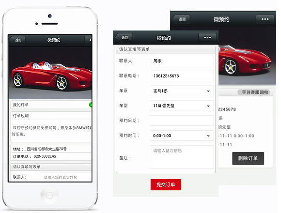 微預約是商家利用微營銷平臺實現在線預約的一種服務,可以運用于汽車、房產、酒店、醫療、餐飲等一系列行業,用戶通過在線預約功能,提交需求。商家可及時收到用戶的預約信息,讓用戶和商家可以高效的互動!