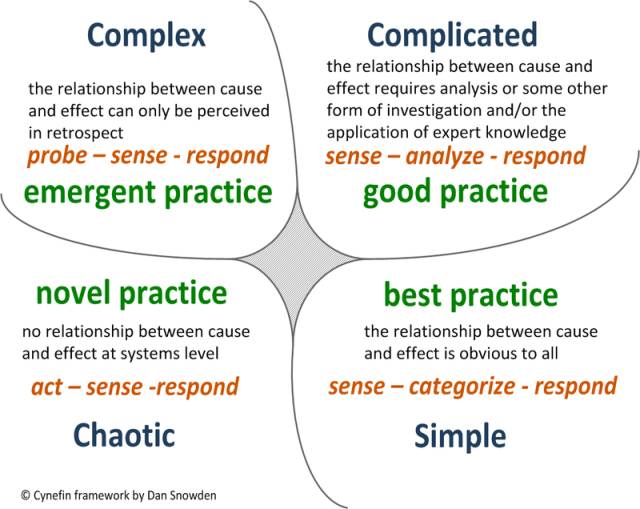復雜(Complex)問題,該域中的因果關系僅能夠從回顧中發現,解決這些問題的方法是探索-感知-響應(Probe-Sense-Respond),我們能夠感知涌現實踐(emergent practice)