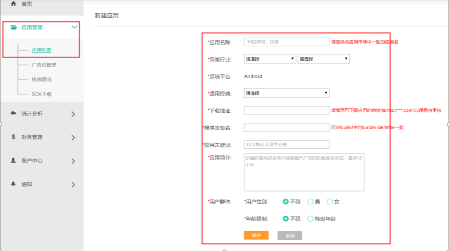 注:應用創建完成后,應用ID即生成。狀態進行審核中,審核中的應用不可進行編輯。但可以新建廣告位。應用審核通過后,創建廣告位,下載SDK植入代碼,即可請求廣告。